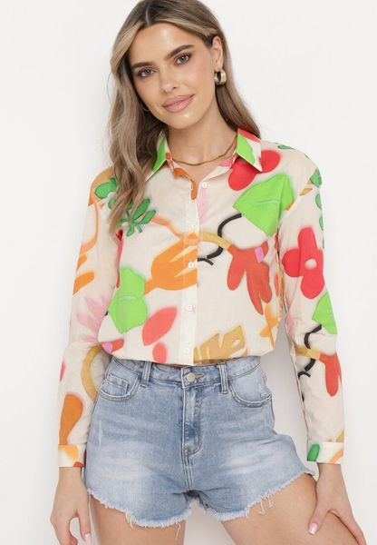 Beżowo-Zielona Koszula z Bawełny w Abstrakcyjny Kwiatowy Print Bellamist