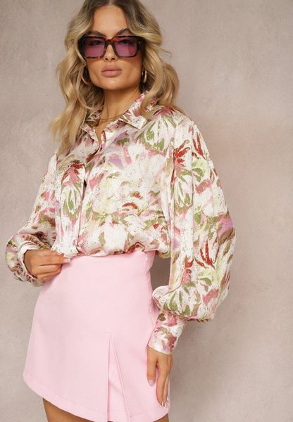 Beżowo-Różowa Koszula z Guzikami i Nadrukiem z Metalicznym Połyskiem Crimalia