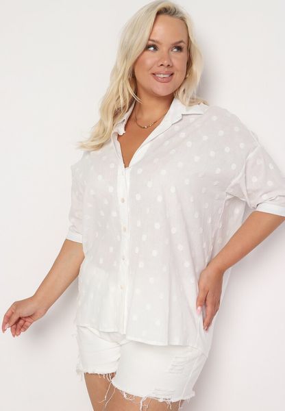 Biała Bawełniana Koszula z Krótkim Rękawem w Ozdobne Kropki Tinasenna