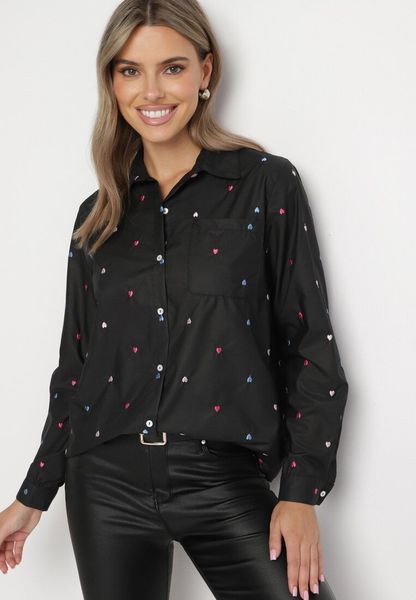 Czarna Koszula z Dodatkiem Bawełny Ozdobiona Kieszonką i Haftami Serc Meristia