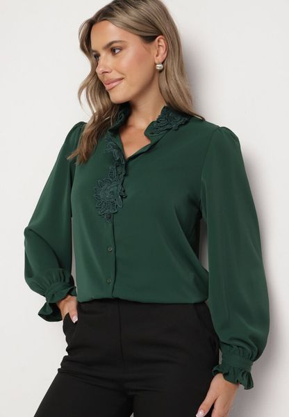Ciemnozielona Koszula ze Stójką i Koronkowymi Aplikacjami Zeanissa