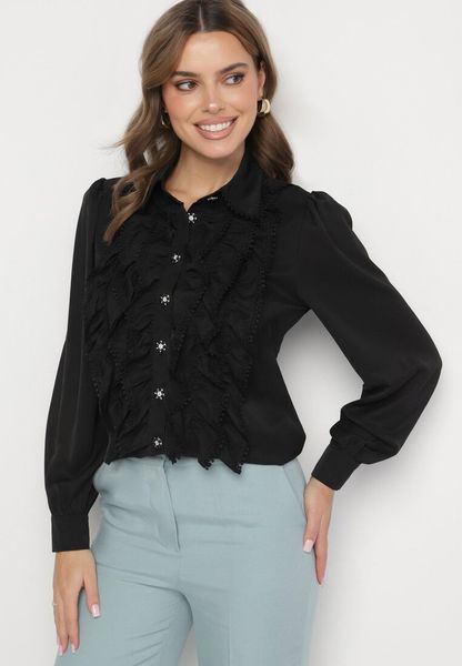 Czarna Koszula z Ozdobnymi Guzikami i Falbankami Zdobiona Cyrkoniami Deliael