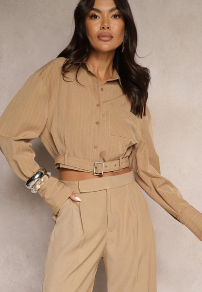 Beżowa Krótka Koszula Ozdobiona Wzorem w Paseczki i Paskiem z Klamrą Atinef