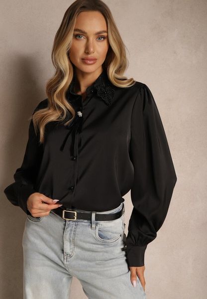 Czarna Koszula z Bufiastymi Rękawami Kołnierzem z Perłami i Broszką Gonathiel