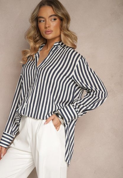 Granatowa Koszula z Bawełny w Pionowe Prążki z Cyrkoniami Jarilea