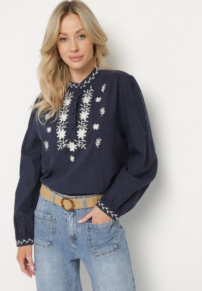 Granatowa Koszula z Bawełny ze Stójką i Guzikami Zdobiona Haftem Gonithiel