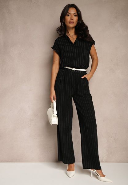 Czarny Komplet z Wiskozy w Prążki Koszula na Krótki Rękaw ze Spodniami Fenlina