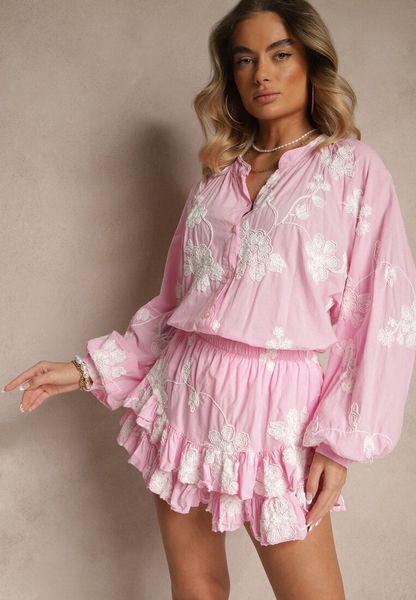 Różowy Komplet z Bawełny Spódnico-Spodenki i Koszula z Szerokimi Rękawami Savalene