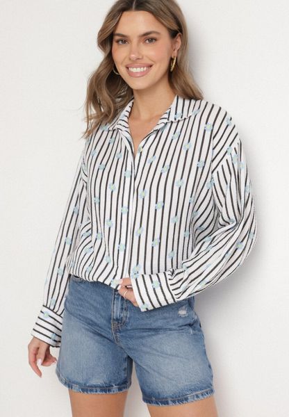 Czarno-Biała Bawełniana Koszula w Paski z Kwiatowym Zdobieniem Ameliora