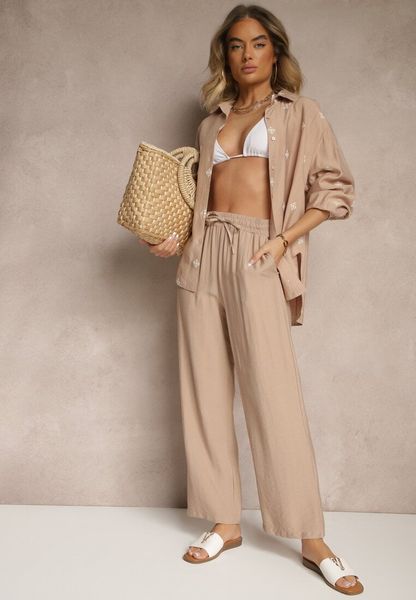 Ciemnobeżowy Wiskozowy Komplet Oversize Zdobiony Haftem Koszula i Spodnie Sadrianae