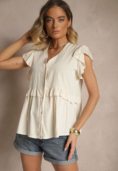 Jasnobeżowa Koszula z Wiskozą Zdobiona Falbankami z Dekoltem w Serek Alisetta