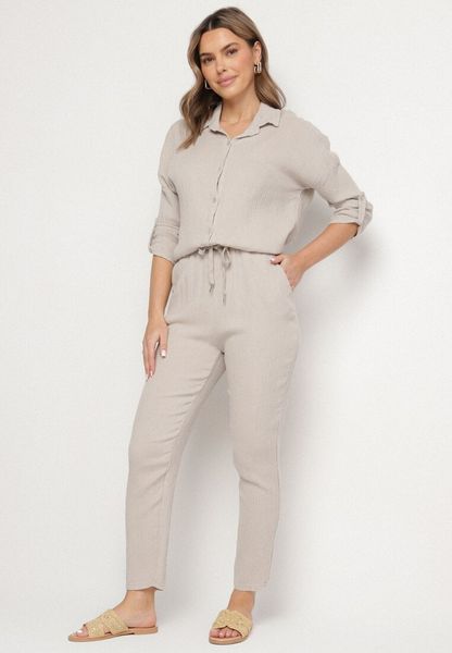 Beżowy Bawełniany Komplet Muślinowy Koszula z Regulowanymi Rękawami i Spodnie Janilene