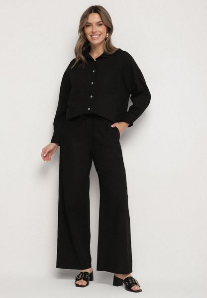 Czarny Komplet z Lnu i Bawełny Koszula i Szerokie Spodnie Fenelli