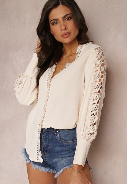 Jasnobeżowa Koronkowa Koszula z Ozdobnym Dekoltem i Guzikami Mylie