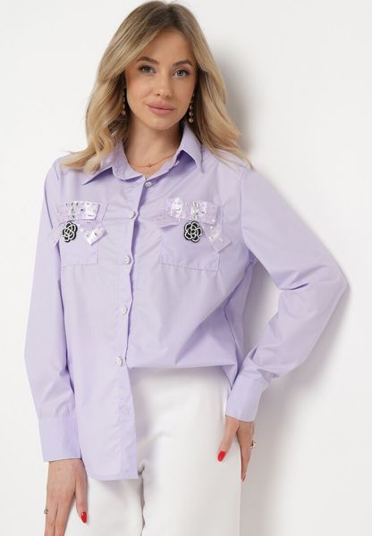 Fioletowa Koszula na Biżuteryjne Guziki ze Zdobionymi Kieszeniami Nerlla