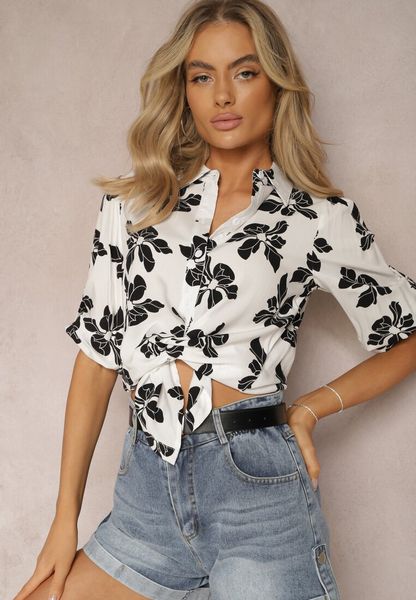 Biało-Czarna Wiskozowa Koszula w Kwiaty z Podpinanymi Rękawami 3/4 Siasse