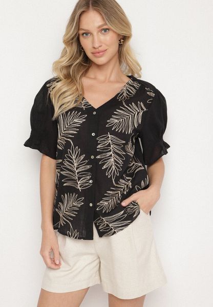 Czarna Bawełniana Koszula Zapinana na Guziki z Haftem i Przeszyciami Ozdobną Nicią Varavia