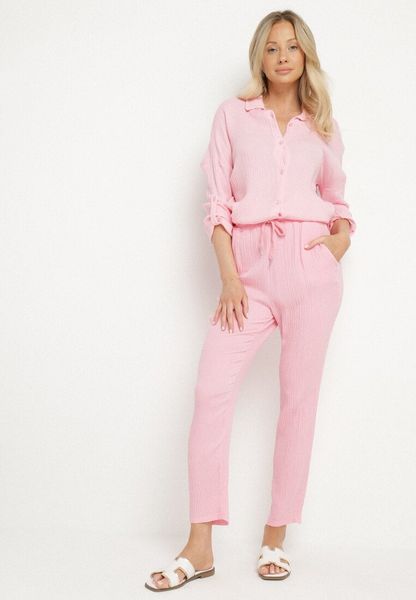 Jasnoróżowy Bawełniany Komplet Muślinowy Koszula z Regulowanymi Rękawami i Spodnie Janilene