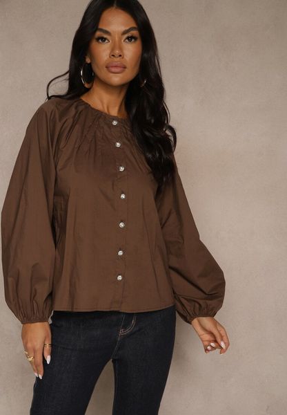 Brązowa Bawełniana Koszula Ozdobiona Marszczeniem i Guzikami z Cyrkoniami Zenana