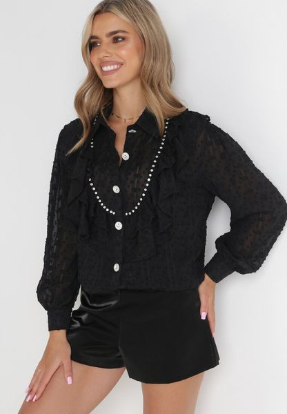 Czarna Koszula Plumeti z Błyszczącą Nitką i Falbankami Banie