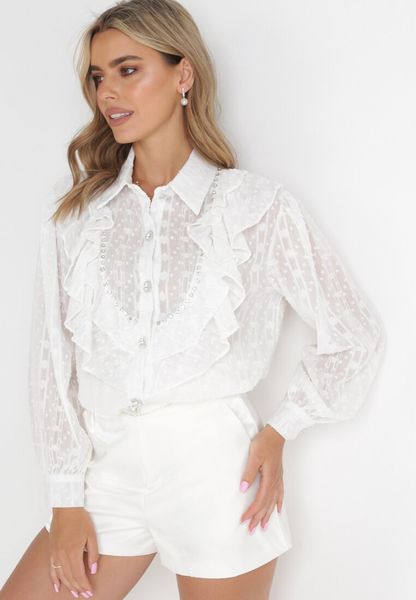Biała Koszula Plumeti z Błyszczącą Nitką i Falbankami Banie