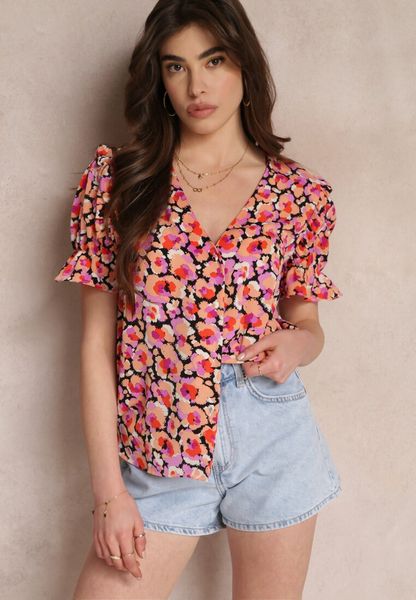 Koszula Vanilisa z ozdobnymi ramionami z falbanką. Krótkie rękawy i głęboki dekolt. Wykonana z kwiecistej tkaniny. Zapinana na powlekane guziki. Doskonała do jeansów czy szortów.