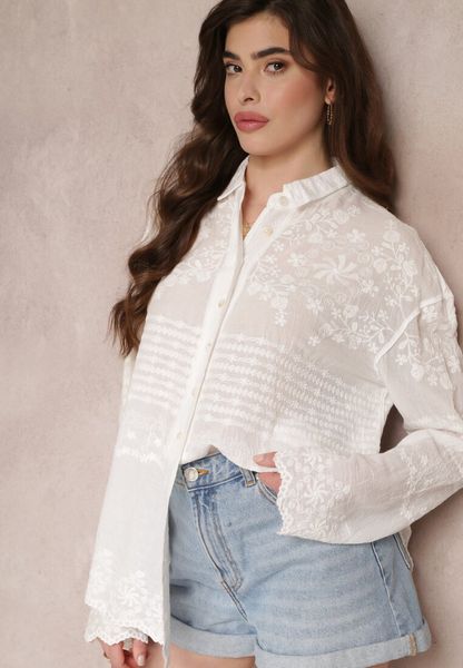 Biała Przezroczysta Koszula z Bawełny z Haftem w Kwiatki Kariela
