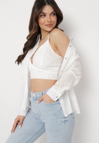 Biała Bawełniana Koszula Ażurowa z Topem na Cienkich Ramiączkach Leassen