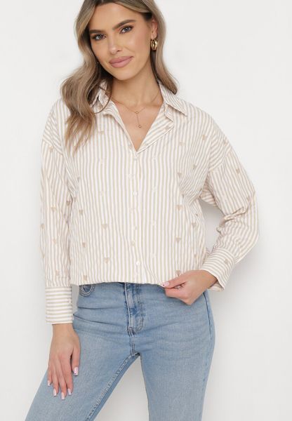 Jasnobeżowa Koszula Bawełniana w Paski z Haftowanymi Serduszkami Sanileni