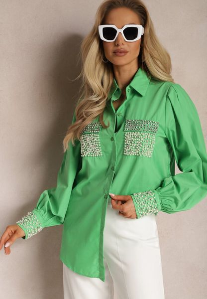 Zielona Koszula z Biżuteryjnymi Cyrkoniami i Perełkami Quezia
