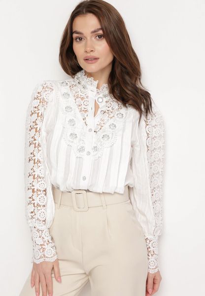 Biała Koszula z Ażurowymi Wstawkami z Cyrkoniami i Perełkami Taia