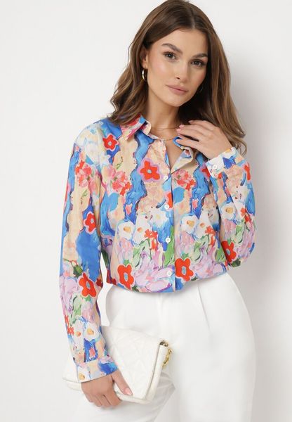 Niebiesko-Beżowa Bawełniana Koszula na Guziki z Artystycznym Motywem z Kwiatami Prisil