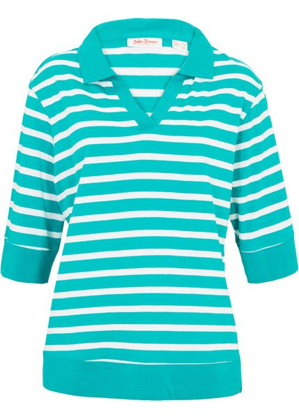 Luźniejszy shirt polo z szerokim rękawem i kołnierzem. Całkowita dł. w rozm. 40/42 ok. 66 cm. Można prać w pralce.
