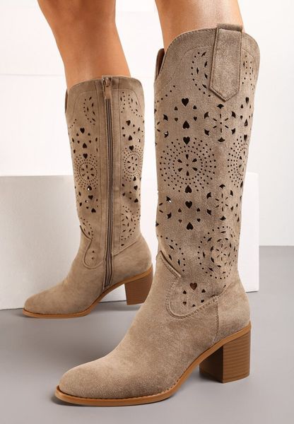 Ciemnobeżowe Ażurowe Kozaki Kowbojki na Ściętym Słupku ze Skórzaną Wkładką Crasida