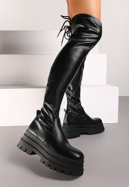 Czarne Kozaki Typu Muszkieterki za Kolano na Grubej Podeszwie z Regulowaną Wysoką Cholewką Railei