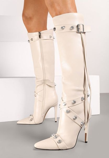 Beżowe Kozaki na Szpilce z Noskiem w Szpic i Cholewką Zdobioną Paskami z Ćwiekami Zindilia