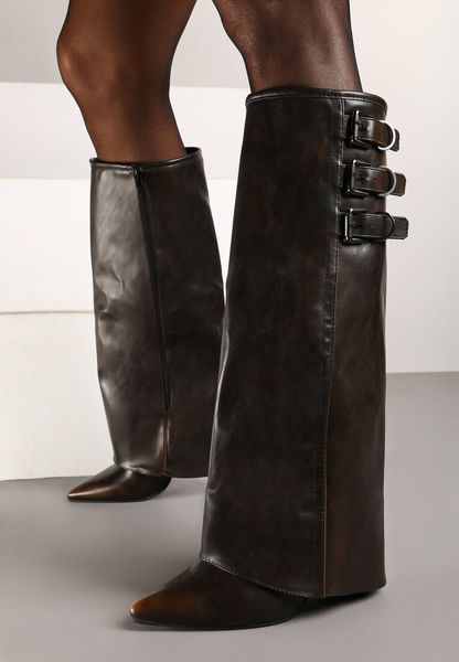Brązowe Kozaki na Słupku z Wywiniętą Cholewką Klamrami i Paskami Renniel