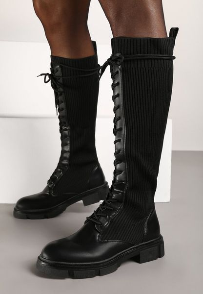 Czarne Sznurowane Kozaki na Płaskiej Podeszwie z Elastyczną Cholewką Annathe