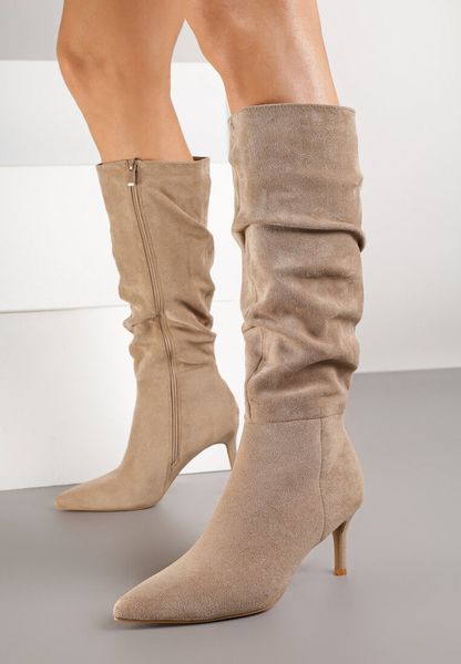 Ciemnobeżowe Kozaki z Imitacji Zamszu na Szpilce z Marszczoną Cholewką Rilareia