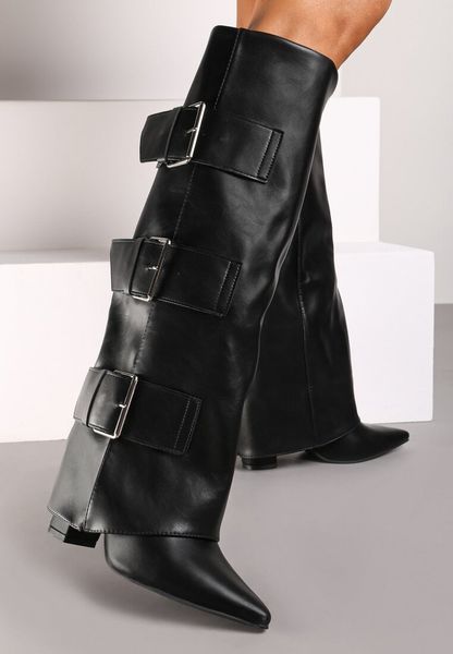 Czarne Rockowe Kozaki na Słupku z Wywiniętą Cholewką Wykończone Klamrami Navlaya