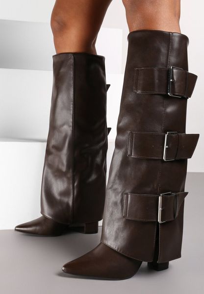 Brązowe Rockowe Kozaki na Słupku z Wywiniętą Cholewką Wykończone Klamrami Navlaya
