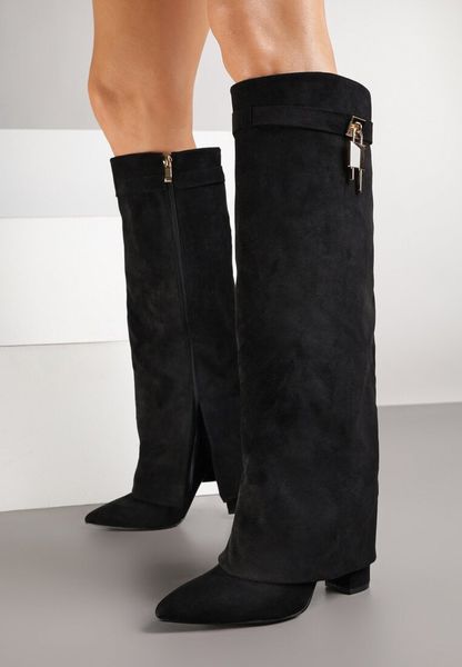 Czarne Kozaki na Obcasie z Wywiniętą Cholewką i Kłódką Latilira