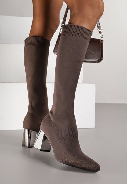 Brązowe Eleganckie Kozaki VICES na Metalicznym Obcasie ze Skarpetkową Cholewką Nalaina
