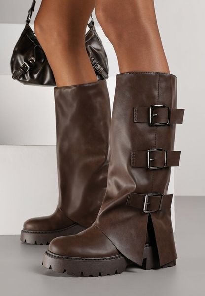Ciemnobrązowe Kozaki VICES z Wywiniętą Cholewką Zdobioną Sprzączkami Anileria