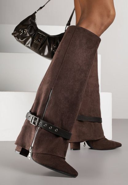 Brązowe Kozaki Kowbojki na Słupku Ozdobione Klamrą i Wywiniętą Cholewką Unalasa