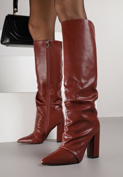 Bordowe Eleganckie Kozaki do Kolana na Słupku z Marszczoną Cholewką Badira