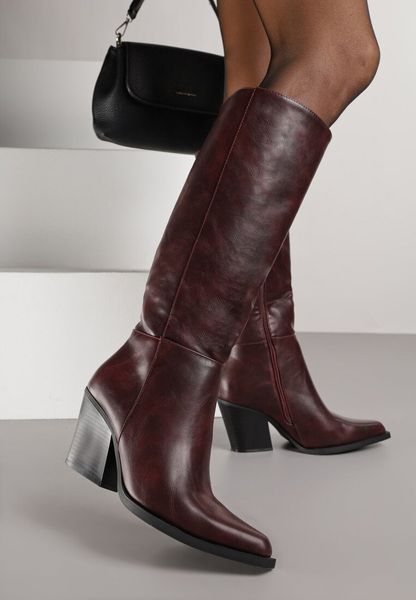 Bordowe Kozaki do Kolana na Obcasie Typu Stożek ze Szpiczastym Noskiem Seorina