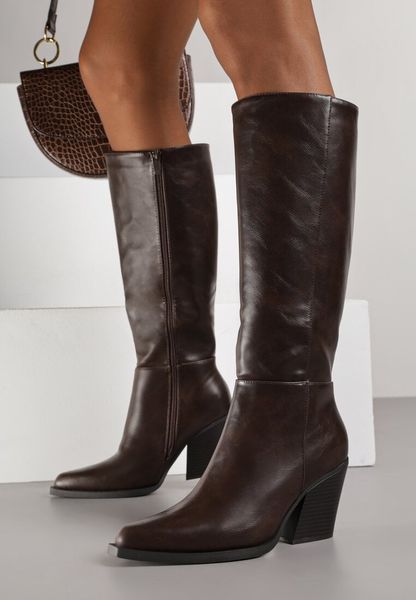 Brązowe Eleganckie Kozaki do Kolana na Stożkowym Obcasie z Noskiem w Szpic Seolina