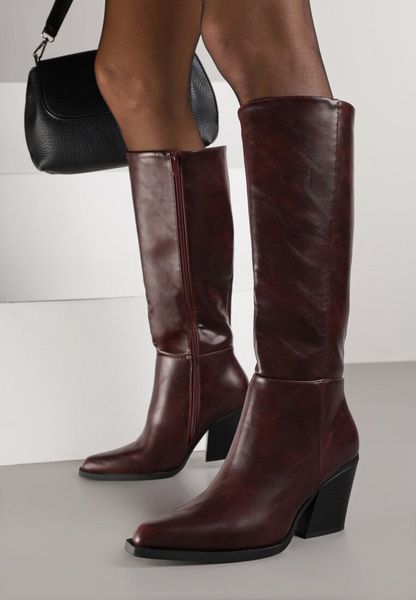 Bordowe Eleganckie Kozaki do Kolana na Stożkowym Obcasie z Noskiem w Szpic Seolina