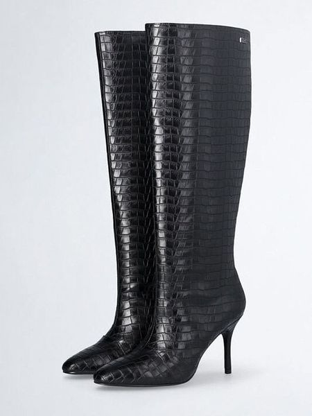 – zapięcie: suwak- noski: w szpic- noski i zapiętki: wzmocnione- powierzchnia: o fakturze krokodylej skóry- forma obcasa: szpilka- podeszwa: antypoślizgowa